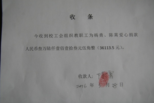 3月18日以后,校工会又收到为杨勇老师爱心捐款人民币36113.5元。3月28日下午,校工会已将此笔捐款全部转交到杨勇老师的妻子陈霄老师手中。现将捐款情况公示如下: