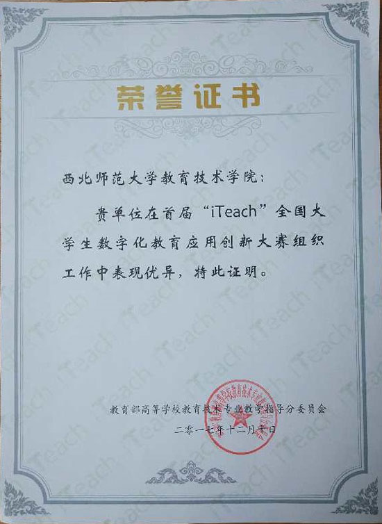 近日,首届“ITeach”全国大学生数字化教育应用创新大赛决赛在南京师范大学举行。西北师大教育技术学院学生荣获一等奖2项、二等奖8项、三等奖6项,教育技术学院荣获优秀组织奖。