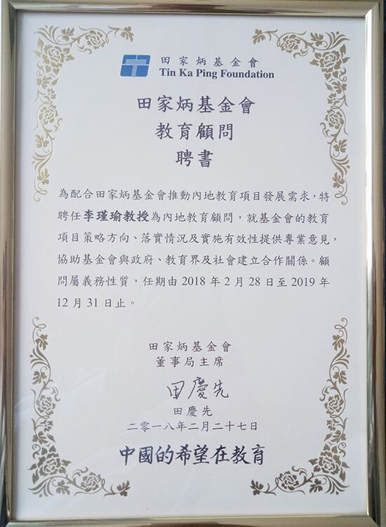 西北师大李瑾瑜教授受聘田家炳基金会内地教育顾问