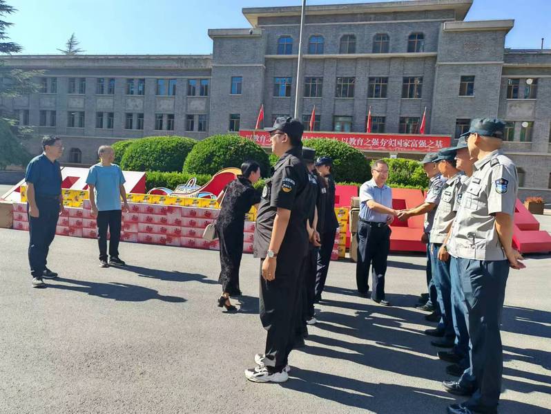8月19日上午,学校党委副书记、工会主席王全进,党委常委、党委组织部部长周琳辉带领工会工作人员,分别来到后勤保障部工作一线、党委武装保卫部门卫工作岗、基建处工地现场,开展暑期送清凉慰问活动。
