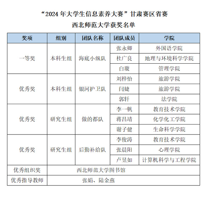2024年大学生信息素养大赛(甘肃赛区)近期落下帷幕,西北师大选派6支本科生队伍和4支研究生队伍共计30人参赛。经过激烈的角逐,学校荣获团队一等奖1项、优秀奖3项,2位教师获优秀指导教师奖,学校荣获优秀组织奖。