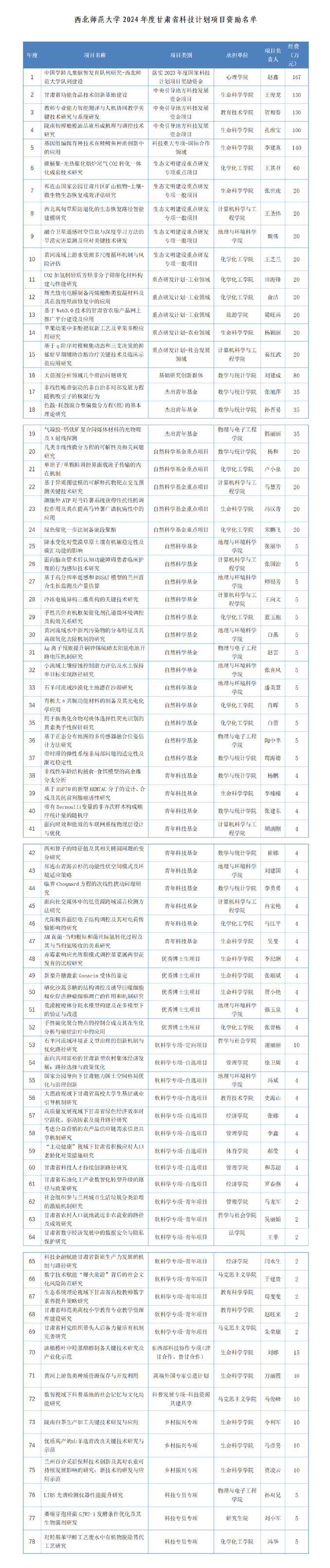 近日,甘肃省科学技术厅陆续下发了2024年度甘肃省科技计划项目(含中央引导地方科技发展资金项目)资助名单。西北师大共获批2024年度省科技计划项目78项,资助经费合计1455万元,较上年增加608万元。
