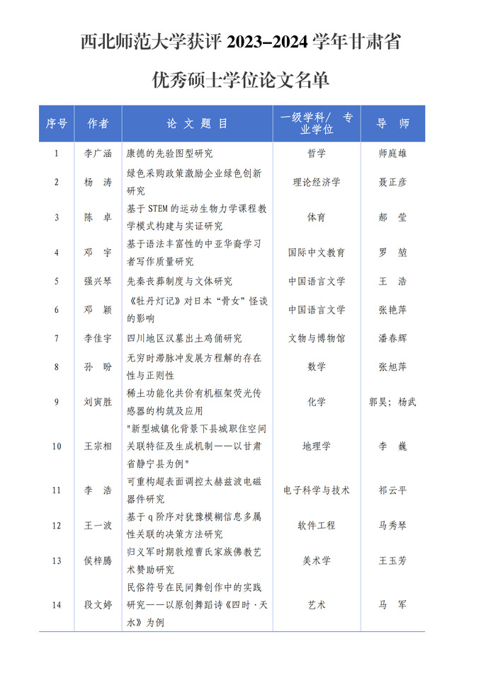 近日,甘肃省学位委员会、甘肃省教育厅公布了2023—2024学年甘肃省优秀博士硕士学位论文评选结果,西北师大共获评优秀博士、硕士学位论文20篇,其中优秀博士学位论文6篇,优秀硕士学位论文14篇。