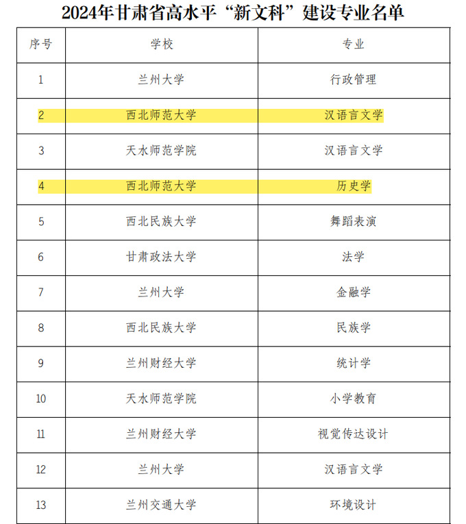 近日,甘肃省教育厅发布《甘肃省教育厅关于公布2024 年甘肃省高水平“四新”建设高校、专业认定结果的通知》,西北师大被遴选认定为2024年甘肃省高水平“新文科”建设高校。学校计算机科学与技术、材料科学与工程、制药工程3个专业被遴选认定为2024年甘肃省高水平“新工科”建设专业;汉语言文学、历史学、体育教育3个专业被遴选认定为2024年甘肃省高水平“新文科”建设专业。