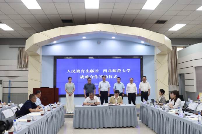 黄强表示,回望历史,双方合作是友好交往之需;立足现在,双方合作是时代发展之需;展望未来,双方合作是真诚共赴之约。作为我国基础教育教材建设的“国家队”和“主力军”,人教社出版了大量滋养数代学子的精品教材与学术著作,其中凝聚着众多西北师大学者的卓越智慧,为双方深化战略合作奠定了坚实基础。今天,秉承优势互补、合作共赢原则,双方开展全方位战略合作,既是贯彻落实党的二十大和全国教育大会精神,推动教育强国建设的时代发展之需,也是教育使命所系、情怀所向。下一步,我们要将战略合作框架协议转化为丰硕成果,围绕共建“教材建设协同创新中心”,在教材研发、学术出版、人才培养、科研项目联合攻关、高水平学术交流平台构建及数字教育资源共享等领域开展深度合作,携手探索教育出版与高等教育融合发展的新路径,共同为建设教育强国、办好人民满意的教育贡献智慧和力量。