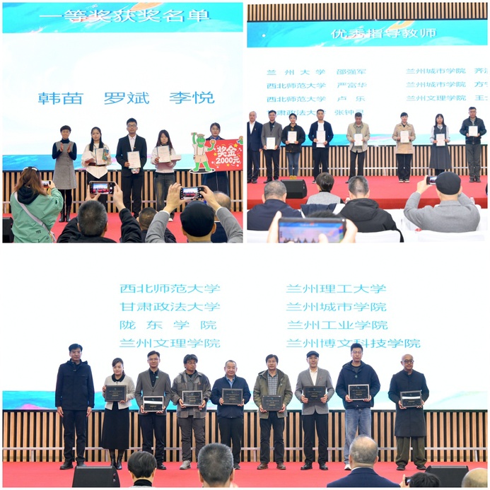 典礼现场播放了一等奖作品集锦,评审专家对获奖作品进行了专业点评,与会嘉宾分别为获奖师生和优秀组织单位代表颁发证书与奖品;参赛师生代表在交流中分享了参加比赛的心得体会;甘肃省博物馆网络中心主任李延强作了题为《让文物触手可及——甘肃省博物馆数字化实践与公共服务创新》的主旨报告。